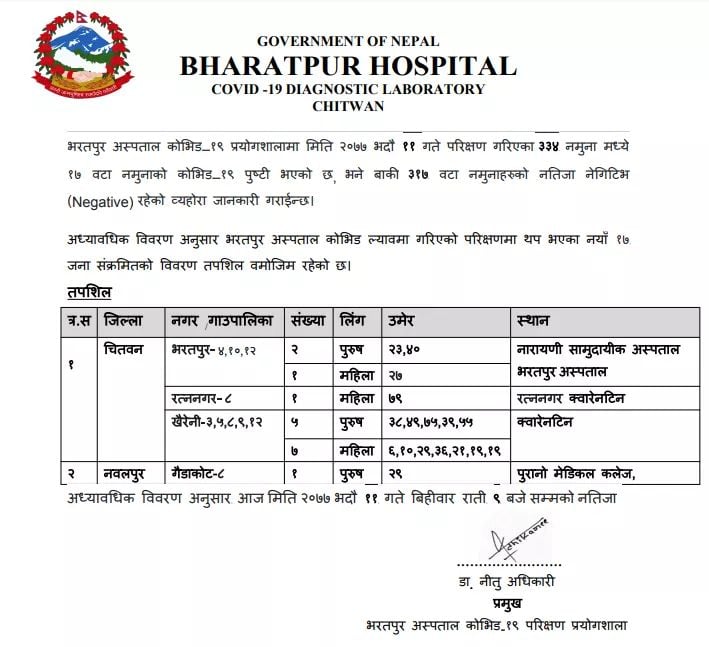 भरतपुरमा संक्रमण पुष्टि हुनेमा नारायणी सामुदायीक अस्पताल र भरतपुर अस्पतालबाट नमुना परिक्षण गरेका हुन भने रत्ननगर र खैरहनीको क्वारेनटिनका हुन । गैंडाकोटका पुरुष पुरानो मेडिकल कलेजका हुन ।