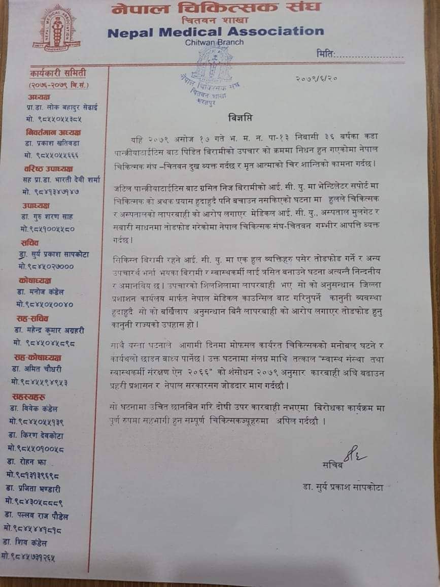 चितवनः बिरामीको उपचारका क्रममा मृत्यु भए पछि चितवन मेडीकल कलेजमा आफन्त द्धारा गरिएको तोडफोड प्रति नेपाल चिकित्सक संघ चितवनले आपत्ति जनाएको छ । जटिल पान्क्रीयाटाइटिस बाट ग्रसित बिरामीको उपचारका क्रममा मृत्यु भएको घटनालाई लिई बिरामीका आफन्तले सघन उपचार कक्ष र अस्पतालको अगाडी रहेका सवारी साधनमा भएको तोडफोड प्रति संघले आपत्ति जनाएको हो ।
